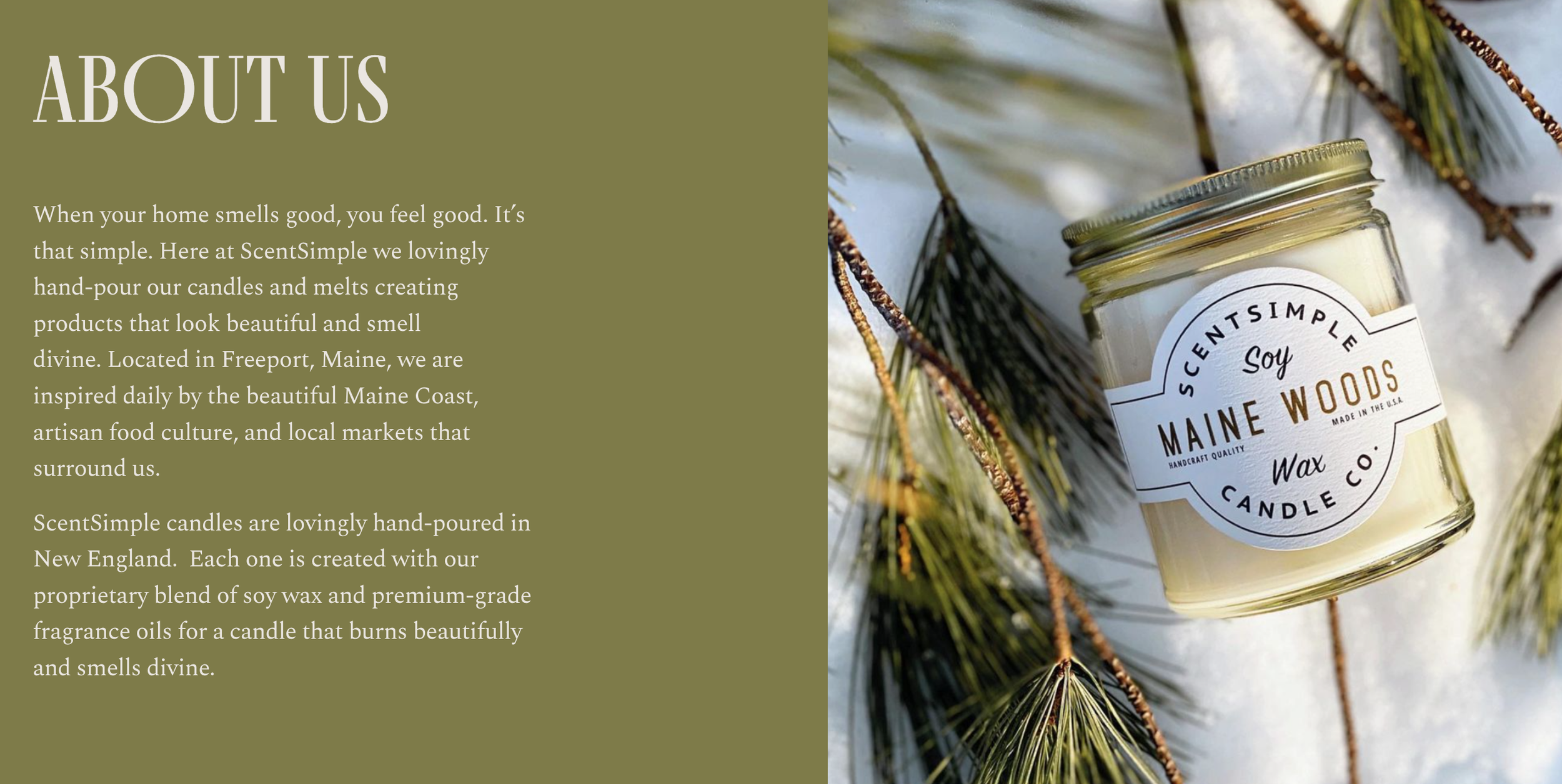Scent Simple Candle Company was a small Maine business and the client for this final project in Web UX Design class in 2024. Students were asked to make or redesign a website for an existing company.